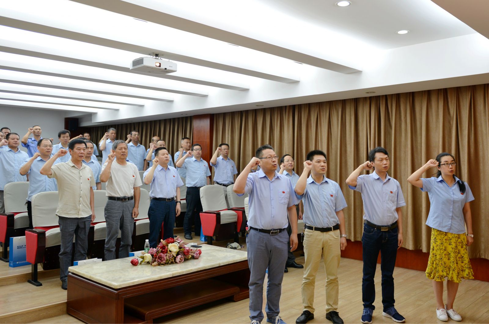 2018年6月30日上午,天門紡機黨委辦公室負責人參加了天門高新園組織召開的主題黨日暨半年工作總結大會,并在會上領取了高新園黨委授予的"先進基層黨組織"牌匾。下午,天門紡機組織全體黨員舉行"七一"慶祝活動,公司黨委副書記、總經理焦倫進主持活動議程,黨委書記魯德文首先作工作報告,回顧了黨的光輝歷程,總結了公司近幾年黨建工作所取得的成績。隨后舉行新黨員宣誓儀式,全體黨員一道重溫了入黨誓詞。接著全國人大代表、公司董事長沈方勇作了熱情洋溢的演講,結合國際、國內形勢,分析了行業及公司面臨的嚴峻挑戰,鼓勵全體黨員樹立信心、勇于擔當、克難奮進,為公司實現打造行業第一品牌的奮斗目標作出應有的貢獻。最后,全體黨員觀看了大型紀錄片《厲害了,我的國》。