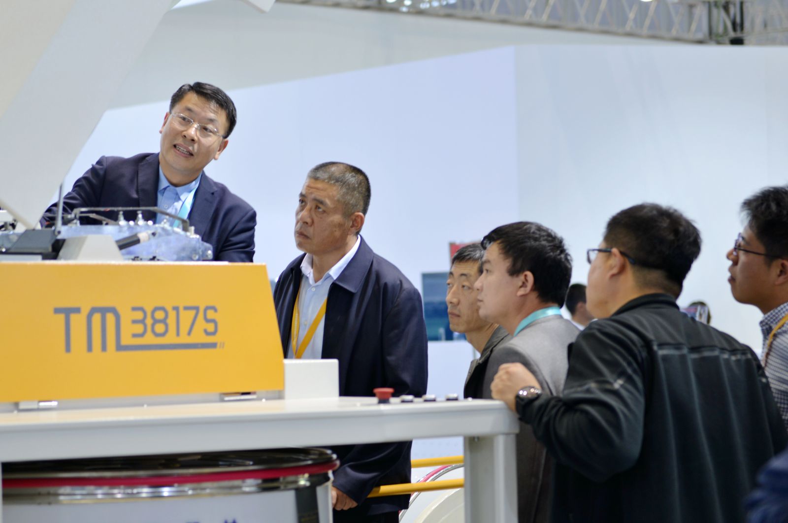 公司董事長(zhǎng)沈方勇向中紡聯(lián)原會(huì)長(zhǎng)杜鈺洲(右3)、中國(guó)紡織機(jī)械協(xié)會(huì)會(huì)長(zhǎng)王樹(shù)田(右2)介紹參展新產(chǎn)品特點(diǎn)
