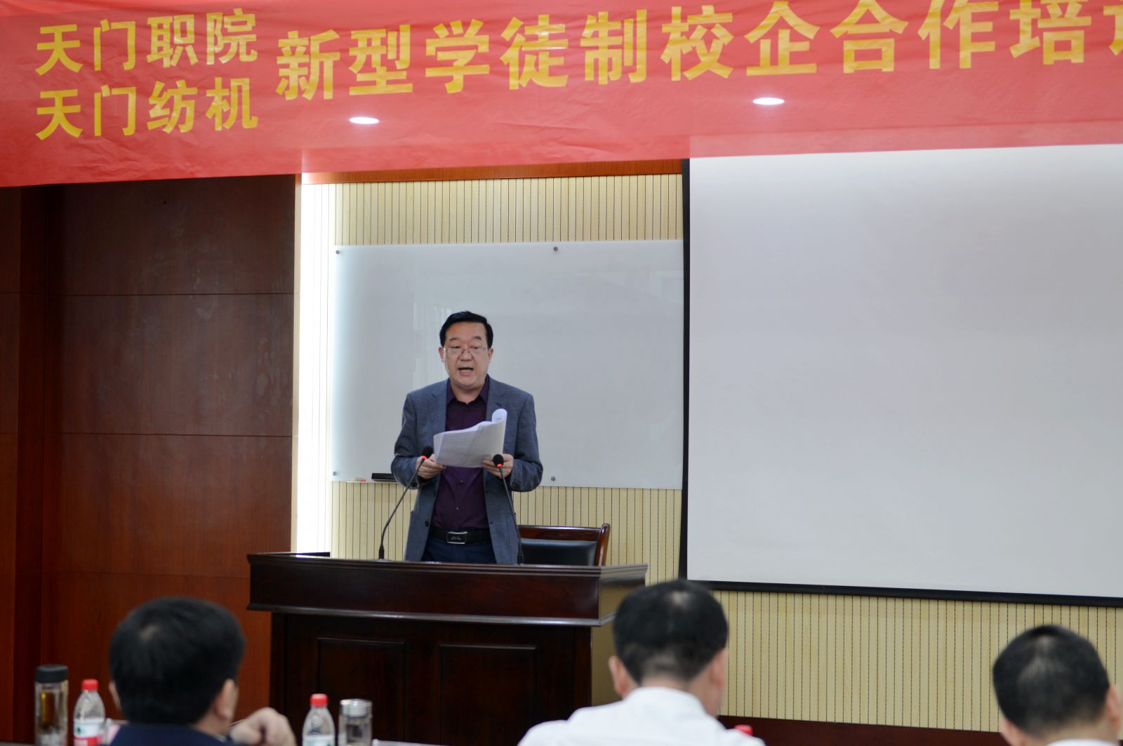 天門紡機黨委書記魯德文介紹了《天門職院與天門紡機新型學徒制培訓方案》,天門職業學院教師何漢兵作了發言,他代表全體培訓教師表態,一定不負期望,精心備課,靈活施教,圓滿完成教學任務。